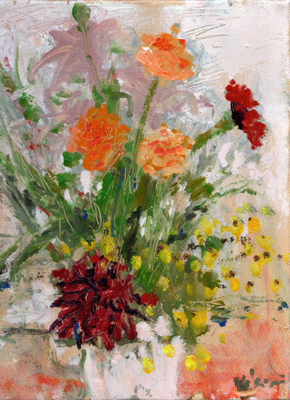 14年度個展出展作品 婚礼の花束を花瓶に移してみた。 華やかな宴を目に浮かべながら、 筆を執った。 私からは遠い方の華燭だが、 まったく「めでたきことはよきことかな」である。 一覧 戻る 次へ Table Back Next