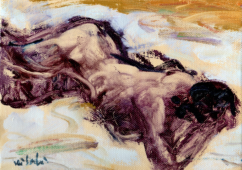 人体は肉付けだと思う。しかしその前に床がある。 平らな所に塊が横たわっている、ということだ。風景や静物も同じ構造だ。 で、それらのものはすべて空気の層につつまれている。 考え過ぎると絵が黒くなってしまう。肩の力を抜いてイッキに仕上げる。 いろいろな前提が自然に身についていなければならない。 忘れっぽい人間にはホント困ってしまう。