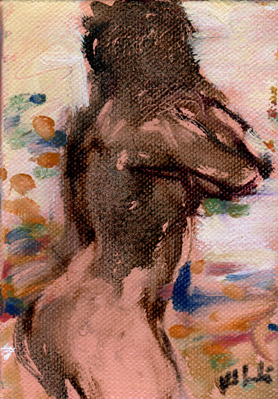 腰から太ももにかけての魅力をどう語ったらいいのだろう? 文字に書けないから、絵に描くのだけど、まったく思うようには描けない。 この絵は、そこのところを瞬間的に描けたかもしれない。 瞬間的じゃないと表現しきれない、ようにも思う。 筋肉の躍動はいつも瞬間的だ。