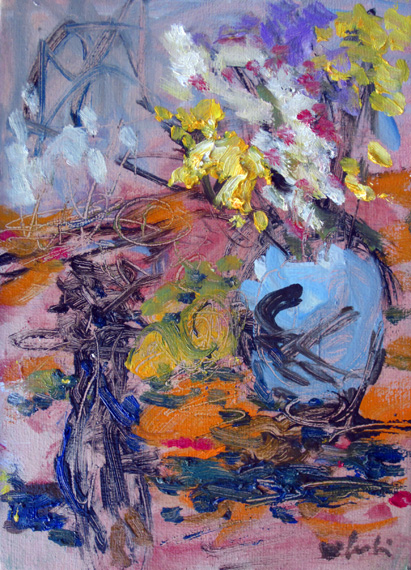 この静物にはスイートピーが描いてある。 手前の黒っぽいのは横笛を吹く彫像だ。 早春の予感と喜びを思いながら描いた、かな?