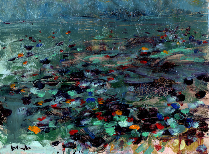 この絵も上掲《海原》と一緒に描いた。 こっちが先。 私は大きい絵から小さい絵へと描き進む。 したがって、この絵のほうが実景に近い。 最後に描く小さい絵は自由で大胆だ。 しかし、海のキラキラ感はこの絵もほうが優っているかも。