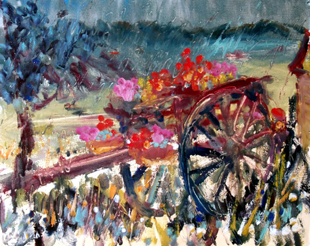 リムーザンのドルドーニュ地方では、コテージに滞在した。 ここの奥さんが絵を描く。 日本流に言えば民宿の女将さんだ。 花の世話も大切な仕事。 使わなくなった古い荷車を花で飾って、お客さんを迎えている。 その心意気と、パッと見たときの印象に筆が動いた。 たくさん描いた。