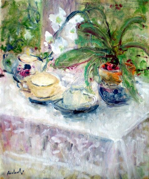 この絵は窓辺の静物の向うの窓の緑が主題だった。